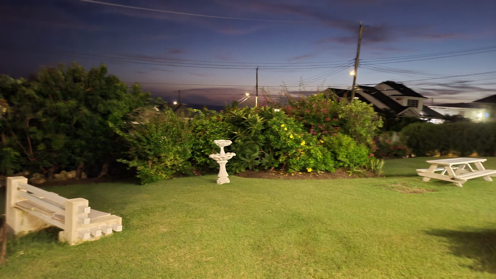 The grounds are beautifully manicured, with mature flowering plants and fruit trees that add color, fragrance, and natural charm throughout the property.